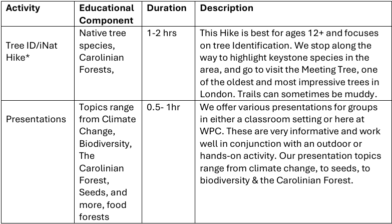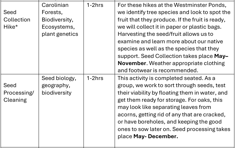 Community Tree Nursery Programming Options (Offered Mon-Thurs)